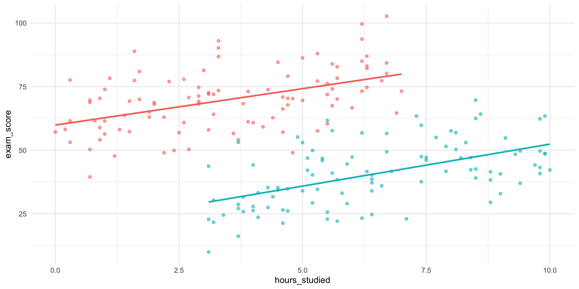 lm(formula = exam_score ~ hours_studied + group, data = data)