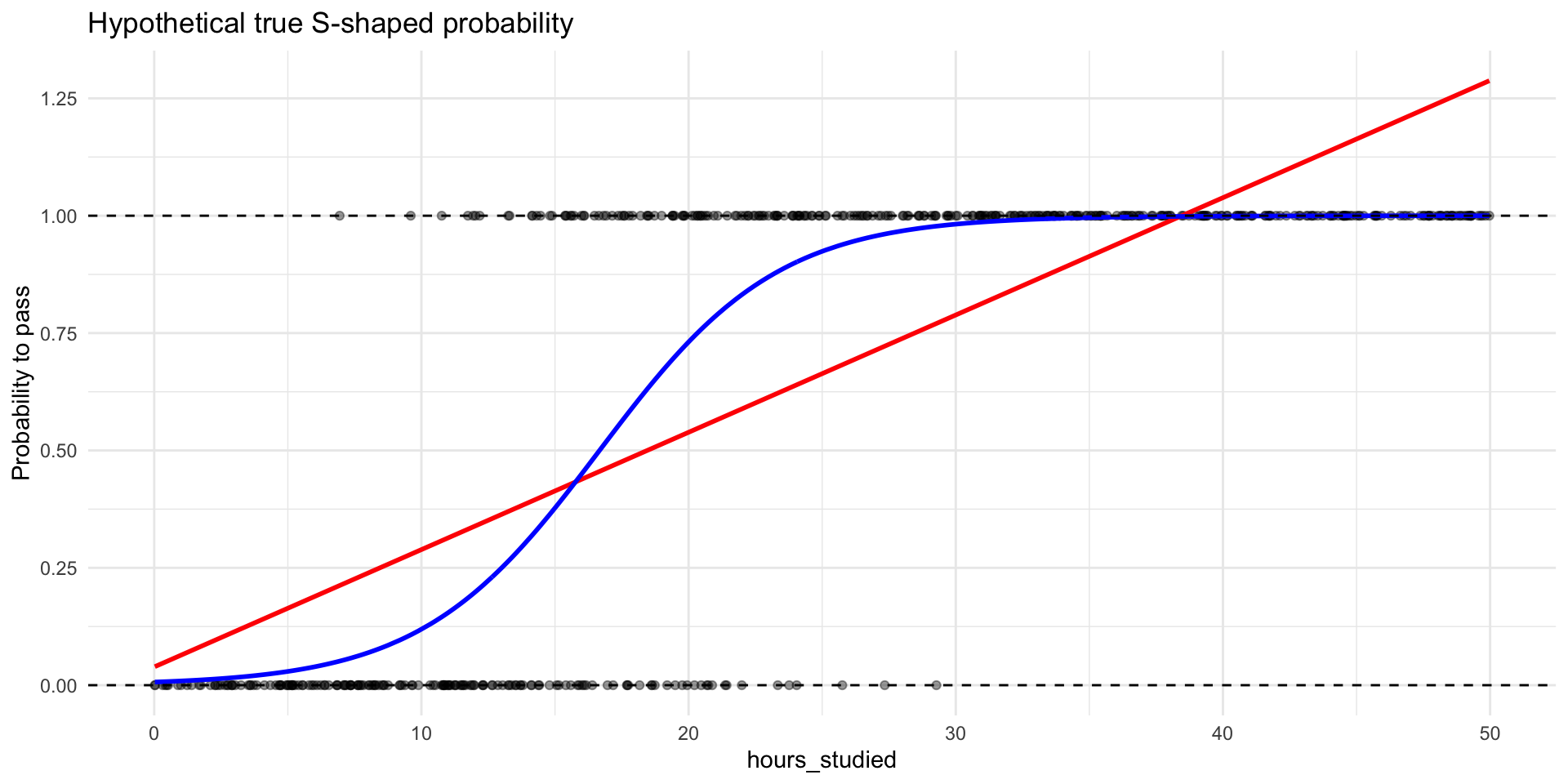 If we think the true relationship between \(X\) and the probability of \(Y=1\) has this S-shape, then we need a mathematical model that can produce that shape.