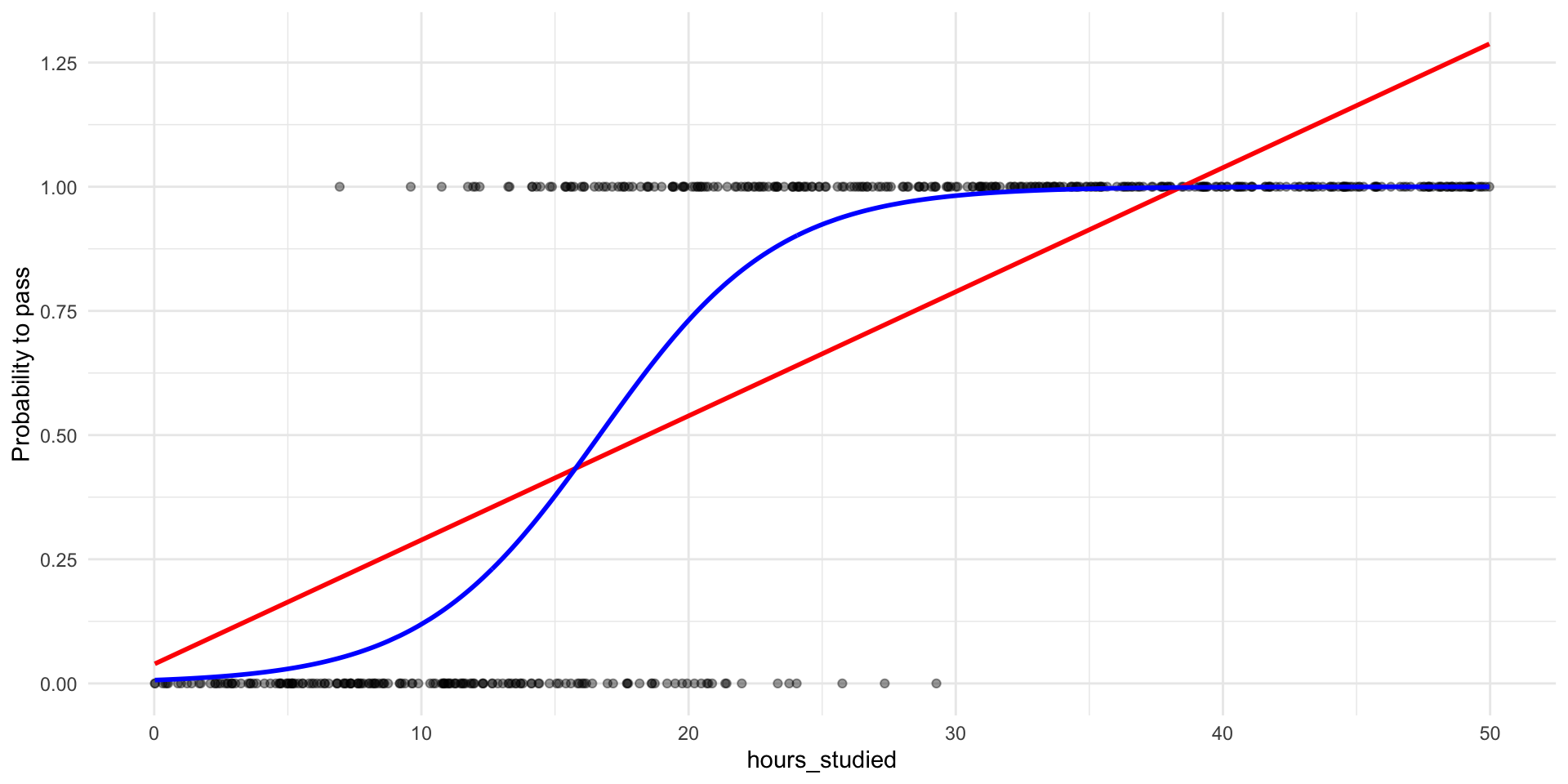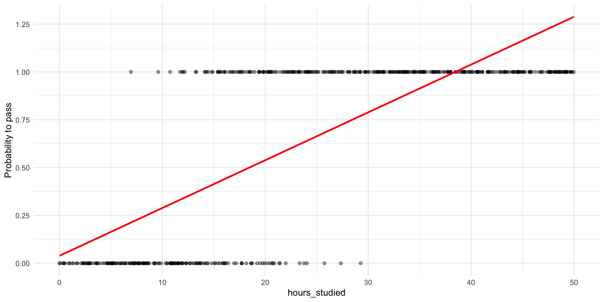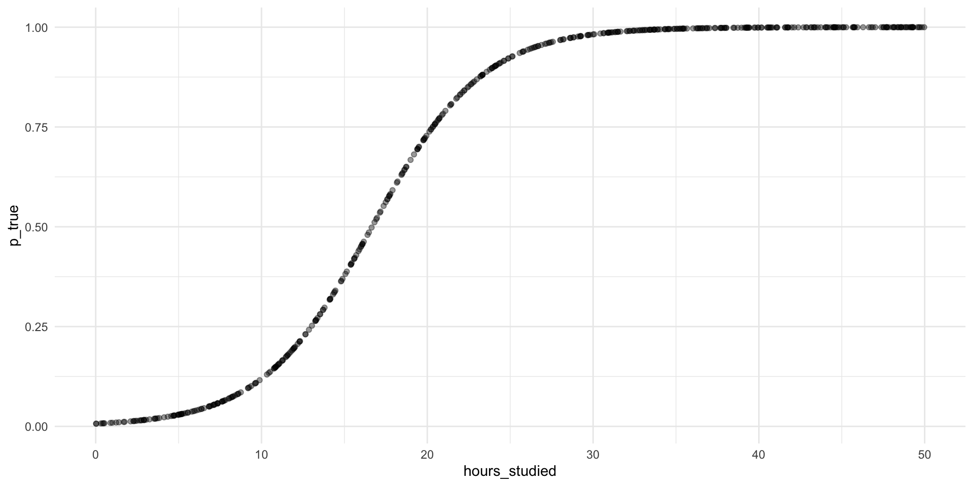 # New R function glm(): Generalized linear model# For logistic regression we have to specify `family = binomial`# (`family = gaussian` gives OLS)m1 <-glm(pass ~ hours_studied, family ="binomial", data = p_data)