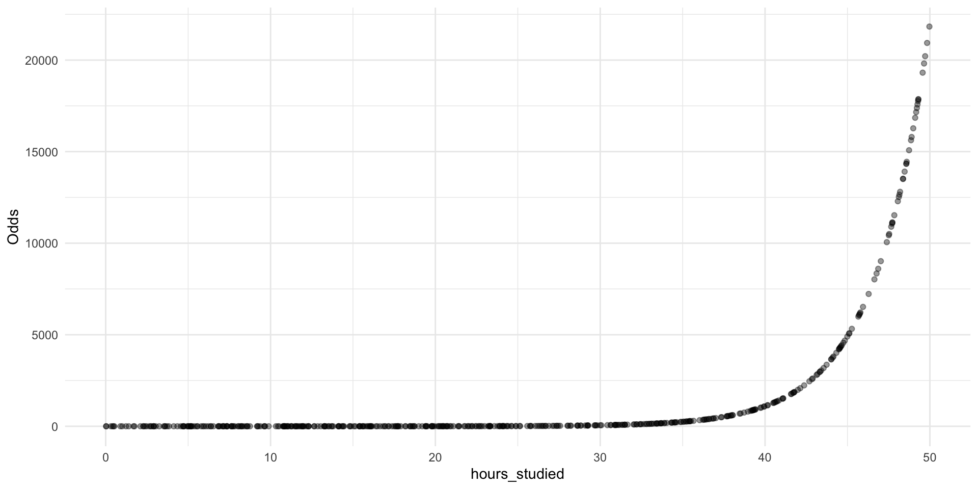 When hours_studied = 0, the estimated odds of passing are \(e^{\beta_0} = 0.005\).