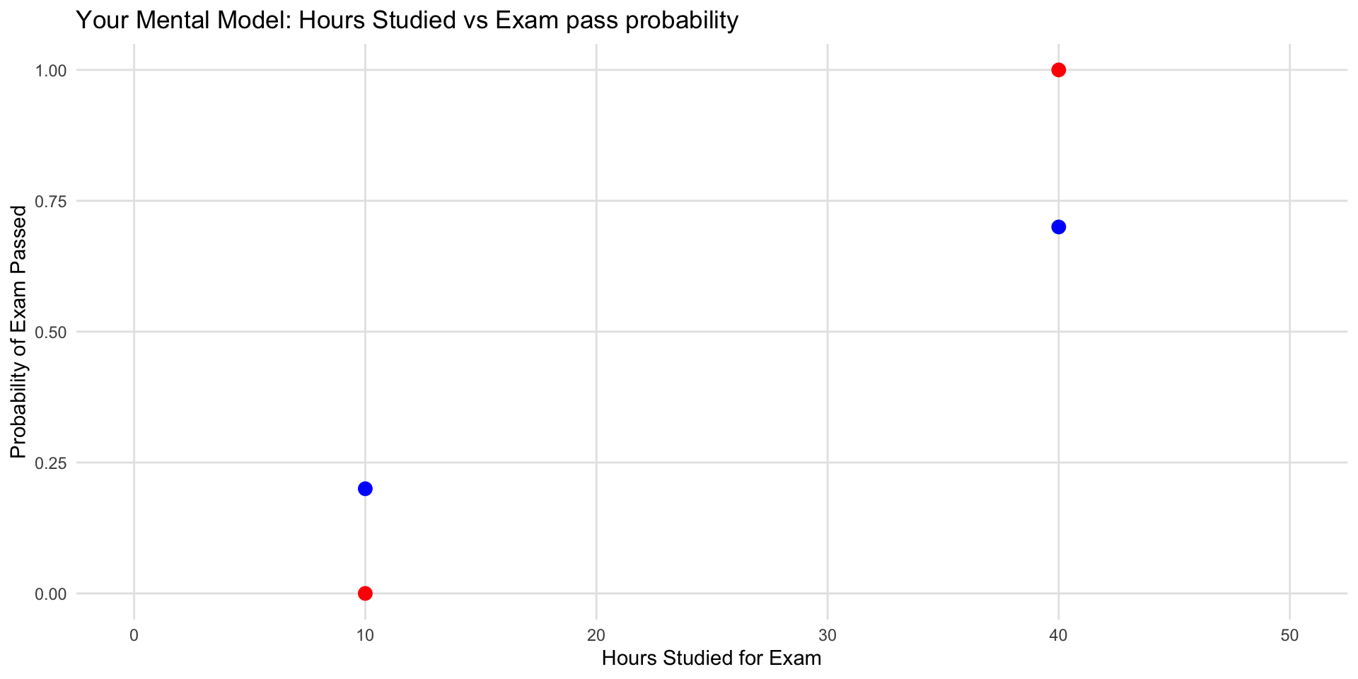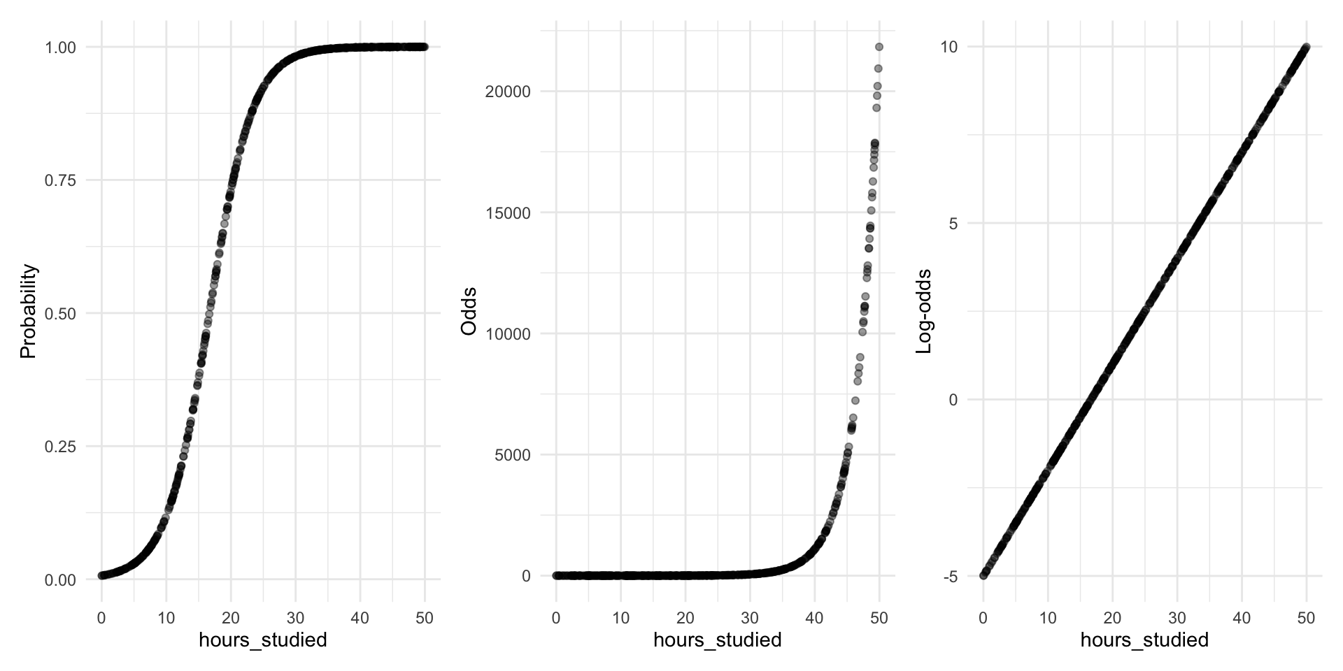 Each additional hour studied multiplies the odds of passing by \(e^{\beta_1} = 1.36\) (i.e., about 36% increase in the odds per hour studied).