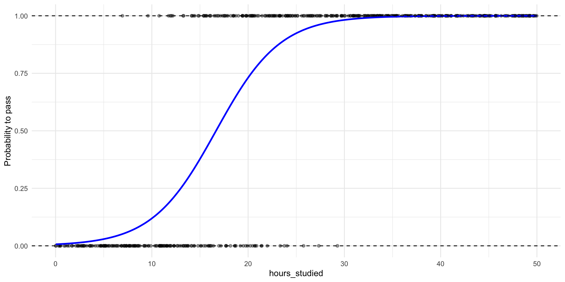 glm(formula = pass ~ hours_studied, family = "binomial", data = p_data)