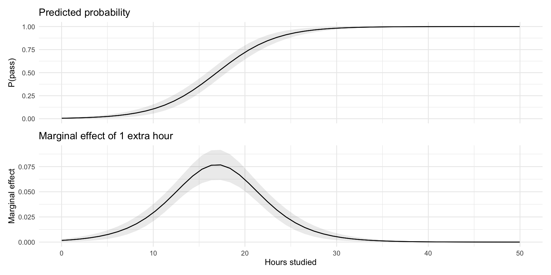 At 22h studied, the change in probability of passing the exam for a one-unit increase in hours studied is \(5\) percentage points, holding other variables constant.